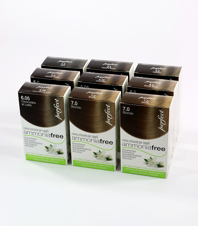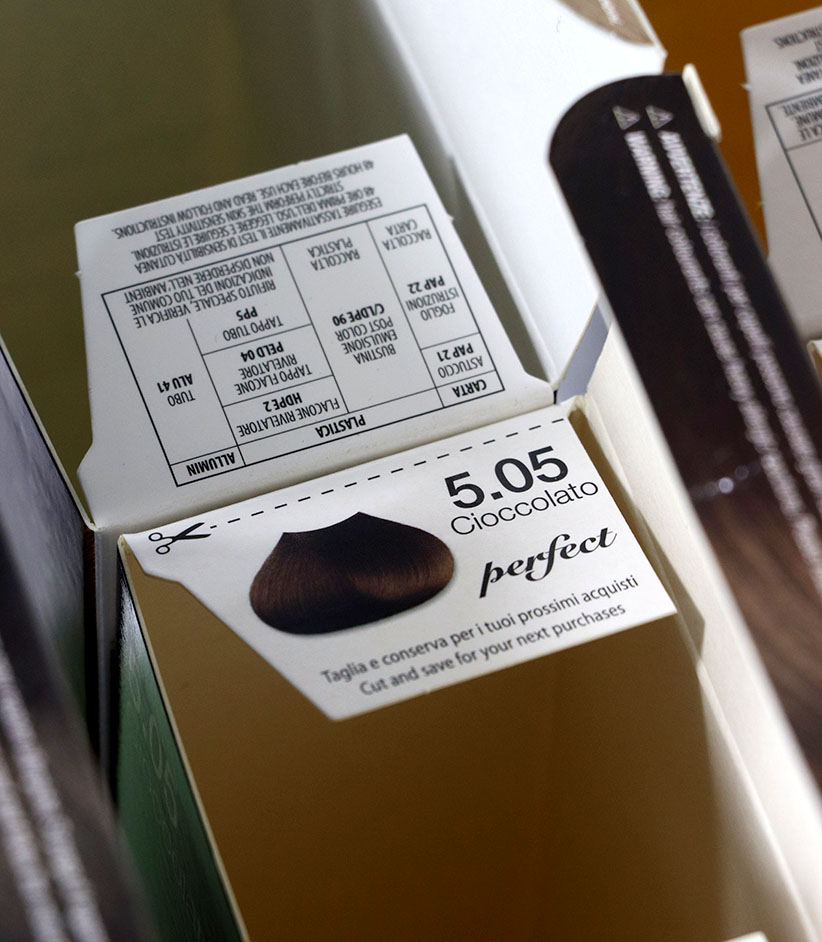 Gli astucci lineari della linea Perfect Ammoniafree – crema colori capelli, sono progettati per il settore Haircare professionale e studiati per coniugare resistenza, estetica ma soprattutto rispecchiano la fedeltà cromatica per agevolare l'acquisto. Realizzati in cartoncino Simcote, garantiscono robustezza e un’immagine premium. La stampa in quadricromia, più Pantone aggiuntivo, consente di ottenere tonalità precise e reali. La superficie è ulteriormente nobilitata con una verniciatura UV lucida, che conferisce brillantezza, protezione e un effetto visivo accattivante. Un packaging che riflette la qualità professionale del prodotto e ne amplifica la percezione, trasformando l’astuccio in uno strumento di comunicazione, di stile e affidabilità.